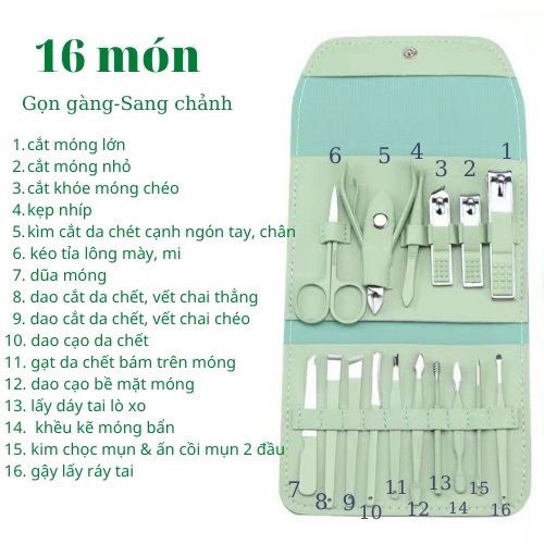Bộ cắt móng tay 16 món được làm từ chất liệu thép không gỉ, có độ bền cao và dễ vệ sinh. Bộ cắt móng tay 16 món khác nhau như kềm cắt móng, kềm bấm móng, bấm móng, dao bấm móng, dụng cụ gọt móng và nhiều phụ kiện khác nữa. Tất cả đều được đựng trong một hộp đựng tiện lợi, giúp người dùng dễ dàng mang theo bộ sản phẩm khi đi du lịch hoặc công tác.